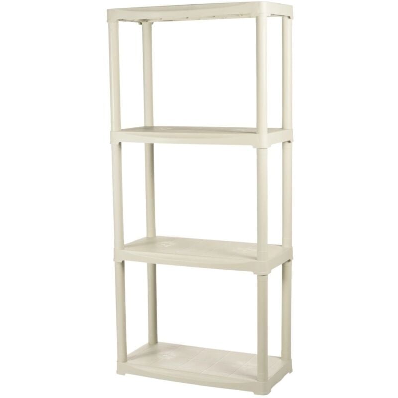 Scaffale componibile da quattro ripiani in plastica color ecrù Scaffale in polipropilene ecrù ideale per riordinare il vostro garage o il vostro ripostiglio. Specifiche tecniche: 4 ripiani Materiale: polipropilene Non assorbe odori Non trattiene umidità Semplice sistema di assemblaggio Portata per scaffale: 20 kg Colore: ecrù Dimensioni articolo Altezza: 176 cm Larghezza: 30 cm Lunghezza: 60 cm