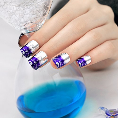 ArtPlus Unghie finte 24pcs Silver Blue Wave Metallic False Nails Premium Pack French Manicure Full Cover Medium Length with Glue Fake Nails Art
