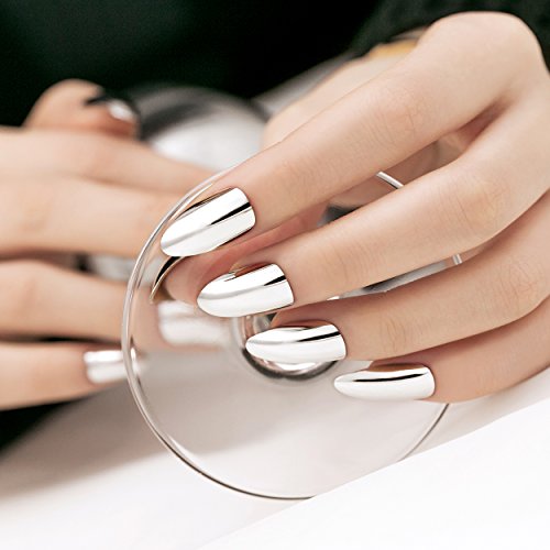 ArtPlus Unghie finte 24pcs Silver Metallic Stilleto False Nails Premium Pack French Manicure Full Cover Medium Length with Glue?Fake Nails Art