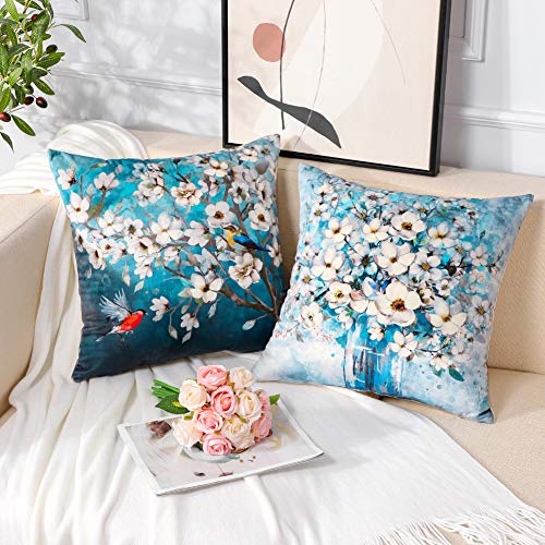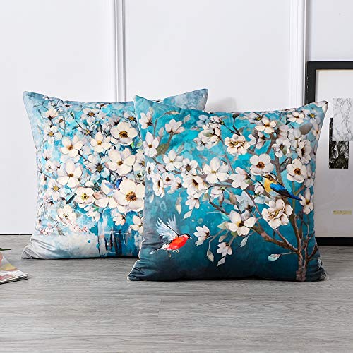 Artscope Federe per Cuscini, Moderna Copricuscini Decorativi in Velluto con Motivo 45x45 cm Fodera per Cuscino, Set di 2 Federa per Soggiorno Sedia Divano (Fiori di Ciliegio Notturni)