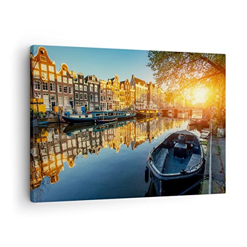 ARTTOR Quadro su tela - Elemento unico - Canale barca Amsterdam acqua - 70x50cm - Pronto da appendere - Home Decor - Stampe su Tela - Quadri Moderni - completamente incorniciato - AA70x50-2857