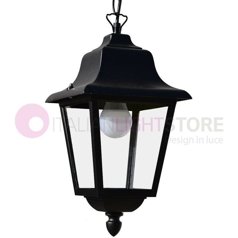 Lampada per esterni in pressofusione di alluminio, in colore NERO GOFFRATO. Lanterna a sospensione, lampadario con catenella per esterni in pressofusione di Alluminio verniciata con polvere poliestere (la verniciatura a polvere viene fatta dopo un trattamento anticorrosivo per elevare la resistenza ai raggi UV e alle nebbie saline), ideale per illuminare facciate di case, spazi aperti, porticati e verande. Dimensioni: larghezza cappello 21 cm., altezza totale 103 cm (regolabile) Caratteristiche tecniche: ° pressofusione di alluminio EN AB 46100 made in Italy, realizzato con materiali di alta qualità;