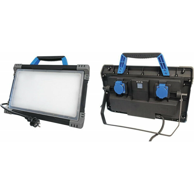 Faro a LED mobile Optiline. 80 W - Alloggiamento in plastica speciale - Pannello diffusore in policarbonato - Due prese di contatto protettive con coperchio a cerniera - Con tubo flessibile in gomma da 3 m H07RN-F G1,5 e spina di contatto protettiva - Temperatura colore 4000 K (bianco neutro) - Durata di vita del LED circa 40000 h - Angolo del fascio LED 100° - 3 livelli di commutazione: 50%. 100%. Off - Classe di protezione IP54 a prova di polvere e spruzzi - Con supporto pieghevole - Testato secondo DIN EN 60598-1
