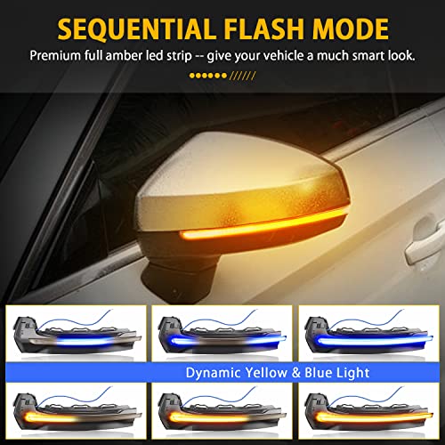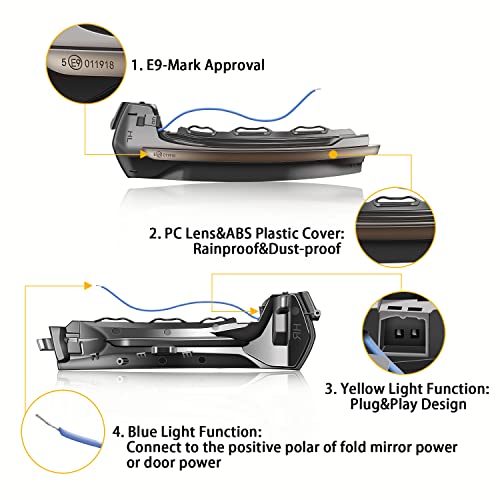 【Illuminazione a LED scorrevole alla Blu e Giallo】 Dinamica sincronizzata con luci di flusso giallo ambra chiaro con lente nera fumo, aggiorna la tua auto in modo più chiaro e alla moda, più in grado di attirare l'attenzione degli altri conducenti. Grado di impermeabilità IP67, proteggerlo funziona normalmente nei giorni di pioggia.