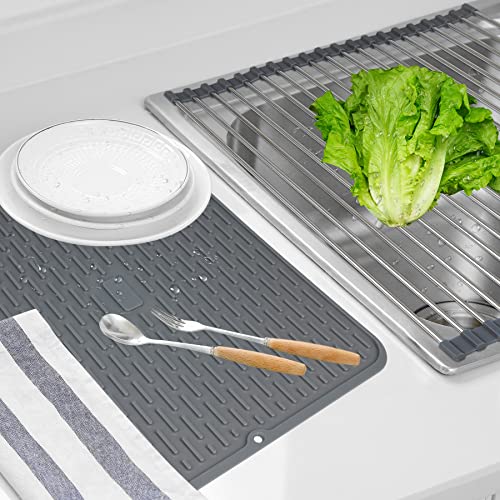 Asciugatura rapida: il tappetino scolapiatti grigio ha un design dritto a coste in rilievo con strisce in silicone rialzate incorporate e il tappetino antigoccia verde ha un design diagonale in rilievo con una superficie piatta al centro riservata per drenare l'acqua. Questo design permette all'aria di fluire e di evaporare rapidamente l'umidità in modo che gli oggetti da cucina come ciotole, pentole, padelle e tazze si asciughino più velocemente.