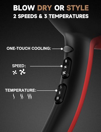 STILE DA SALONE PROFESSIONALE - Questo asciugacapelli ionico ha 3 impostazioni di temperatura e 2 velocità,Raffreddamento one-touch.L'aria calda asciuga e l'aria fresca fissa, consentendoti di personalizzare la tua esperienza di styling. 2 collettori d'aria di diverse dimensioni garantiscono un flusso d'aria concentrato e creano qualsiasi forma. L'ampio diffusore dal diametro di 13 cm crea splendidi styling anche per i capelli ricci lunghi.