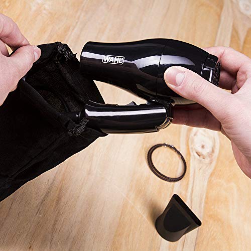 Comprende: asciugacapelli da viaggio, ugello concentratore, ugello diffusore, sacca di conservazione, struzioni, copertura protettiva rimuovibile