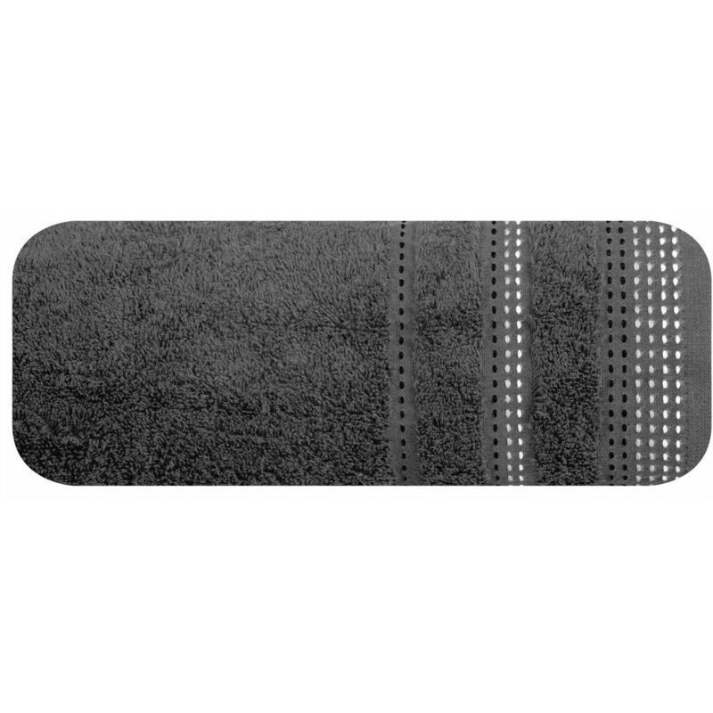Un asciugamano in tinta unita realizzato in morbido e assorbente tessuto di cotone con armatura a spugna, decorato con un colorato bordo stile imbastitura. Facile da lavare, non tinge. larghezza: 50 cm, lunghezza: 90 cm, colore: acciaio, peso: 500 GSM, composizione: 100% cotone
