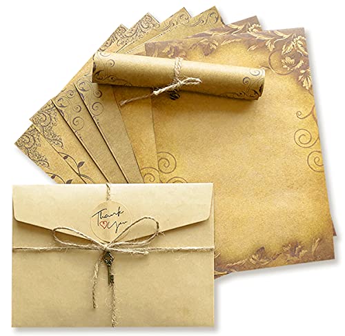 ASFINS Buste e Carta Stazionaria Vintage, Carta da Lettere Vintage Set Include 12 Buste + 24 Carta da Lettere + 12 Adesivi + 12 Corde di Canapa e 12 Accessori in Metallo