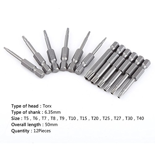 ASHATA 12 Pezzi Set cacciaviti a Stella 1/4 di Pollice,Codolo 50mm S2 Set di Punte per Cacciavite a Stella Magnetica in Acciaio S2 T5-T40,Punte di Cacciavite a Testa Sicurezza Torx