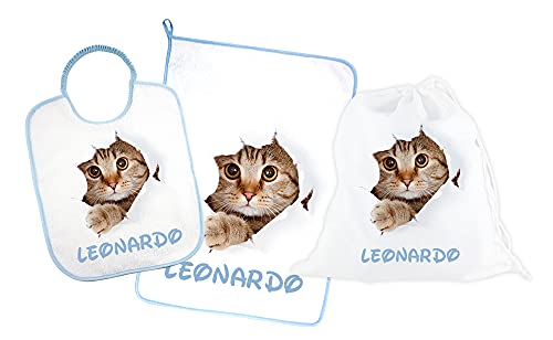 SET ASILO PERSONALIZZATO CON NOME composto da 3 pezzi: bavaglino spugna con elastico cm.27x30, asciugamano cm.40x55 e sacca PERSONALIZZATI Made in Italy - CONSEGNA TEMPESTIVA (GATTO AZZURO)