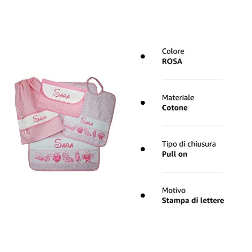 SET ASILO PERSONALIZZATO CON NOME composto da 4 pezzi:bavaglino spugna con elastico cm.28x33, asciugamano cm.40x55, sacca e bustina con fascia PERSONALIZZATI Cotone 100% Made in Italy (ROSA)