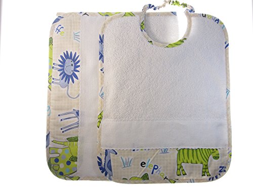 # Bavaglia in spugna bianca 100% cotone, bordata con sbieco in fantasia "savana". Fascia in tela aida bianca ricamabile altezza 5 cm. Sotto la tela aida è applicata una fascia in tessuto di cotone con le immagini di animali che popolano la savana: leoni, zebre, elefanti... su fondo a quadretti beige. Allacciatura con elastico. Dimensioni: 28 x 34 cm.