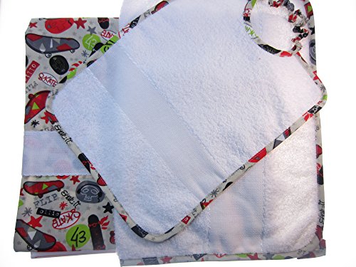 # Bavaglia in spugna bianca 100% cotone, bordata con sbieco in fantasia "skateboard". Fascia in tela aida bianca ricamabile altezza 5 cm. Allacciatura con elastico. Dimensioni: 26 x 34 cm.