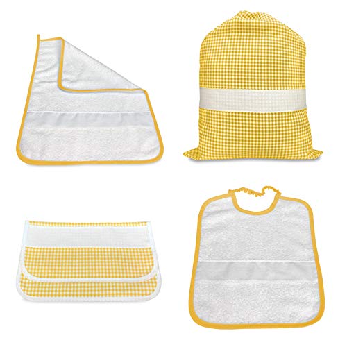 SET ASILO 4 pezzi SACCO e ASCIUGAMANO e BUSTINA A QUADRETTI TINTO IN FILO con tela AIDA per ricamare il nome - Giallo