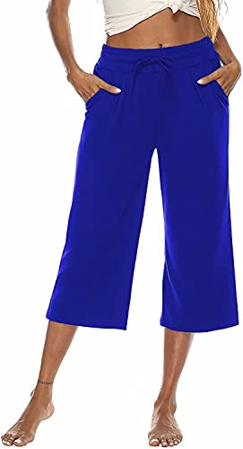 ASKSA - Pantaloni da donna a 3/4, a gamba larga, comodi, con coulisse e tasche, Blu, S