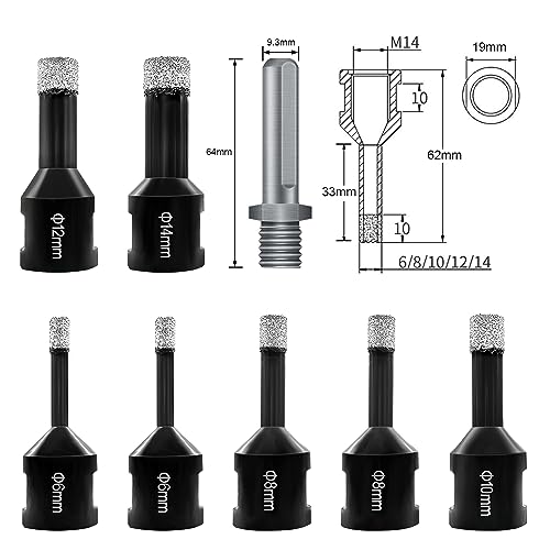 ASNOMY 8Pcs punte diamantate M14 per piastrelle, 6, 8, 8, 10, 12, 14 mm, M14 Punta a tazza diamantata con adattatore, per piastrelle in porcellana, granito, marmo, vetro