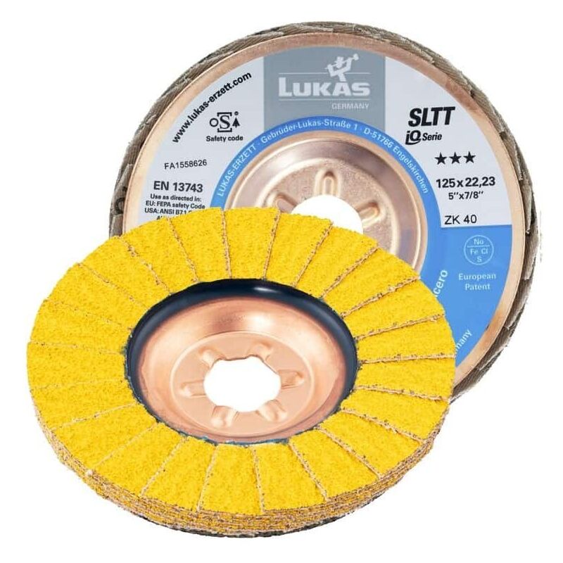 Dati tecnici: Numero: A27201250400044 Diametro D: 125 Diametro H: 22,23 Grana: Ceramica 4 Grana: 40 Marcatura: SLTT 125 Primer: metallo Ordine: 10SLTT per le lavorazioni più impegnative! Efficienza notevolmente maggiore rispetto alle mole o alle mole lamellari convenzionali. Rivestimento/grana: Ceramica 4 - abrasivo molto aggressivo, autoaffilante. Applicazione: Acciai al cromo-nichel e altri acciai inossidabili, pressofusione di zinco, metalli non ferrosi. **La foto è solo a scopo illustrativo.