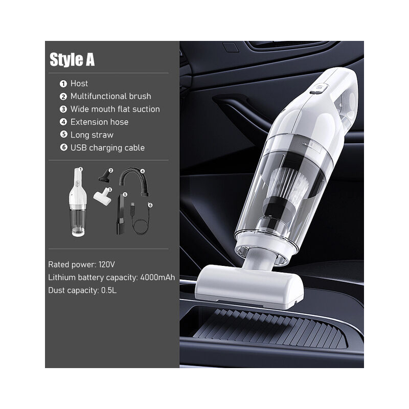 Specifiche tecniche: Nome del prodotto: Handheld Vacuum Cleaner Car Colore: bianco, nero per essere personalizzato (si prega di contattare il servizio clienti) Materiale del prodotto: ABS Tensione nominale: DC 7.4V Velocità nominale: 36000rpm Batteria al litio capacità della batteria: 2*2000mAh Metodo di carica: 5V USB boost cavo di ricarica Potenza nominale: 120W Rumore: ≤ 84dB Temperatura di funzionamento: -20 ℃ ~ + 50 ℃
