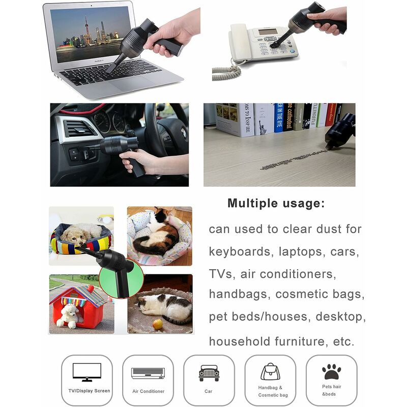 Aspirapolvere portatile multiuso: può essere utilizzato per rimuovere la polvere da tastiere, laptop, automobili, TV, condizionatori d'aria, borse, sacchetti per cosmetici, letti/case per animali domestici, scrivanie, mobili per la casa, ecc. 3 ugelli per una varietà di applicazioni, 2 ugelli rimovibili. Ugello a spazzola per polvere superficiale, ugello piatto per polvere nascosta, ugello a tubo per materiali granulosi fino a 4-5 ore, ricaricabile fino a 1000 volte, utilizzo fino a 5 anni. Due prese d'aria su ciascun lato per una rapida dispersione del calore renderlo abbastanza resistente. I prodotti internazionali hanno condizioni separate, sono venduti all'estero e possono differire dai prodotti locali, tra cui vestibilità, classificazione in base all'età e lingua del prodotto, etichettatura o istruzioni.