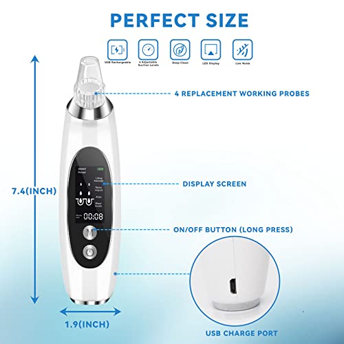 4 MODI & 4 SONDEN: questo pulitore per punti neri dispone di impostazioni intelligenti e manuali. 4 punte intercambiabili con 4 modalità per una soluzione completa di problemi facciali come punti neri, punti neri, acne e acne. Grande testa rotonda: funzione di aspirazione per punti neri, acne, olio. La testa rotonda media è ideale per la zona a T del viso. La piccola testa rotonda è ideale per posizioni sensibili.