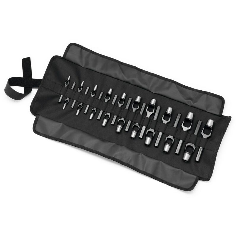 fustella (tagliente) in esecuzione lucida. Interno leggermente conico per rimuovere i residui. Uso: Per forare o creare guarnizioni e anelli di tenuta in gomma, pelle, feltro, plastica, sughero, tessuto o materiali simili. Fornitura: Cad. 1 fustella a cavallotto ⌀ n. art. 832001: 19 pz. Dim. 2-20 (progressione di 1 mm) Nota: Per la tranciatura di legno, pelle e simili. Dati tecnici Tipo di prodotto Utensile per foratura Numero di fustelle a cavallotto 19 Imballaggio Busta avvolgibile