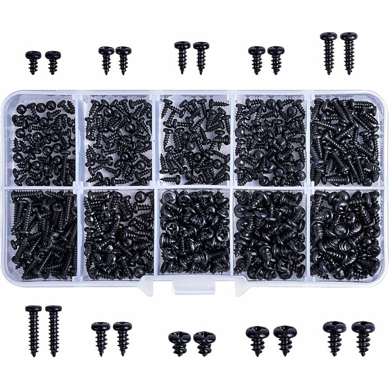10 misure - : 500 pezzi di viti autofilettanti con testa a croce Phillips. M2 x 4 mm/5 mm/6 mm, M2.3 x 5 mm/8 mm/10 mm, M2.6 x 6 mm, M3 x 4 mm/5 mm/6 mm, ogni taglia contiene 50 pezzi. 【Materiale】: tutti i kit di viti sono realizzati in acciaio al carbonio, con finitura in ossido nero, resistente alla ruggine e alla corrosione anche in ambienti umidi. 【Suggerimento Shapp】: queste viti autofilettanti a punta affilata possono forare facilmente il muro e la punta acuminata consente una svasatura rapida e semplice, adatta a casa, ufficio o industria. 【Testa a croce】: le nostre viti nere hanno un design standard con scanalature incrociate, forza uniforme, facili da bloccare, non facili da scivolare, più veloci e più comode da usare. 【Conservazione conveniente】: Forniamo una scatola di immagazzinaggio trasparente con informazioni dettagliate sulle dimensioni. La scatola può mantenere la tua scrivania in ordine o farti trovare rapidamente la dimensione che ti serve