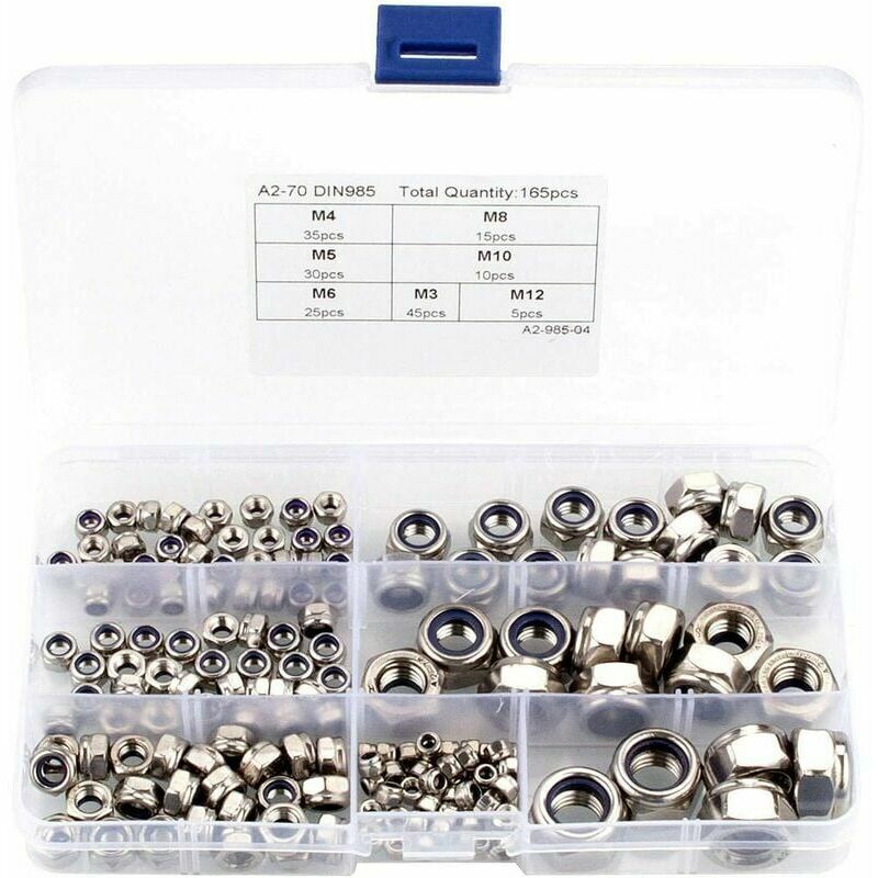 imballaggio 45 dadi di bloccaggio x M3 35 pezzi Dado di bloccaggio x M4 Dado di bloccaggio 30 pezzi x M5 Dado di bloccaggio 25 pezzi x M6 Dado di bloccaggio 15 pezzi x M8 Dado di bloccaggio 10 pezzi x M10 5 dadi di bloccaggio x M12
