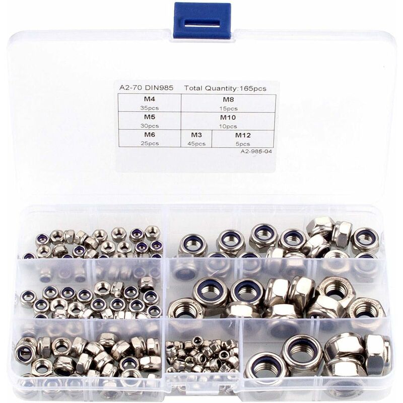 Realizzato in acciaio inossidabile 304, durevole, resistente alla corrosione, elevata durezza 7 dimensioni comuni per uso generale, tra cui: M3, M4, M5, M6, M8, M10, M12 ;Uso versatile, ideale sia per professionisti che per dilettanti Il controdado con inserto in nylon è dotato di un sistema integrato di nylon che afferra i bulloni per impedirne l'allentamento Il collare in nylon può impedire la fuoriuscita dei bulloni per una maggiore sicurezza e tenuta durevole La quantità della confezione è di 165 pezzi, in una scatola di plastica trasparente per la conservazione"