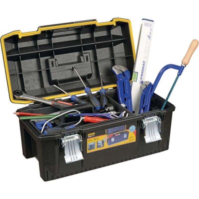 Per impianti sanitari e di riscaldamento · dotato di utensili in artigianato e qualità industriale · nella custodia dell'utensile protetto dall'acqua e dalla polvere · Composto da: 1 chiave trasversale sanitaria 10 funzioni - Rothenberger 1 valvola avvitato set di utensili 2 pezzi. - Rothenberger 1 set di tasti uni-step (scricchiolio e tasto passo) - Chiave express Rothenberger 1 (SW 17/19 M 10) - Cacciavite Rothenberger 1 ciascuno con maniglia multicomponente per viti fessurate Gr. 5,5 x 125 mm - PROMAT ogni 1 cacciavite con maniglia multicomponente per fessura trasversale (PH) 1 x 80 / 2 x 100 / 3 x 150 mm - PROMAT ogni 1 cacciavite con maniglia multicomponente per fessura trasversale (PZD) 1 x 80 / 2 x 100 / 3 x 150 mm - PROMAT 1 custodia per utensili acqua/polvere protetta - Stanley 1 pinze pompa acqua 240 mm - PROMAT per 1 pinze tubo angolare S-Maul 25,4 mm (1) - 38,1 mm (1 1/2) - Martello del fabbro PROMAT 1 con manico in hickory 500 g - PROMAT 1 guanto con manico in hickory