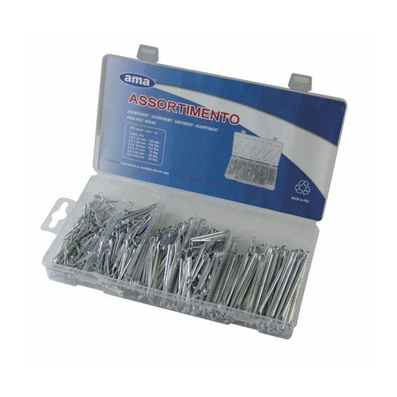 Set di 555 coppiglie assortito contenente: 150 coppiglie standard 1,6x25 mm, 150 coppiglie standard 2,4x25 mm, 100 coppiglie standard 2,4x38 mm, 75 coppiglie standard 3,2x31 mm, 50 coppiglie standard 3,2x50 mm, 30 coppiglie standard 4x64 mm. Sono utili per fissare velocemente gli attrezzi nelle lavorazioni agricole, specialmente nei casi in cui lo smontaggio e il rimontaggio sono molto frequenti. La loro elevata resistenza può garantirne un uso a lungo termine . Sono confezionate in una scatola di plastica organizzata in scomparti . Dati principali Marca: Ama Tipo: assortimento coppiglie Informazioni d'uso Settori di applicazione: agricoltura, macchine industriali, macchine movimento terra, macchine speciali, officina Misure Peso (kg): 0.75 Peso e confezionamento Contenuto: Coppiglie: 150 da 1.6x25, 150 da 2, 4x25, 100 da 2.4x38, 75 da 3.2x31, 50 da 3.2x50, 30 da 4x64