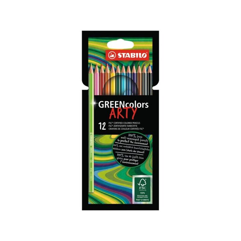 STABILO GREENcolors sono le matite colorate realizzate con il 100% di legno certificato FSC (Forest Stewardship Council). Hanno un fusto esagonale in vernice opaca e una mina colorata di alta qualità con diametro di 3 mm. Le matite colorate disponibili in comodi astucci da 12, 18 e 24 colori. STABILO GREENcolors sono la corretta scelta ecosostenibile per colorare a casa e a scuola! Lunghezza 9,3 cm Peso 70,54 g Larghezza 10 mm Altezza 216 mm Larghezza imballo 113 mm Altezza imballo 67 mm Profondità imballo 220 mm Peso dell'imballo 468,51 g Tipo di imballo Scatola da appendere Quantità per pacco 12 pz Colore penna Multicolore Mina antirottura Sì Diametro mina 2,2 mm Paese di origine Repubblica Ceca Facile da maneggiare Sì Certificazione FSC
