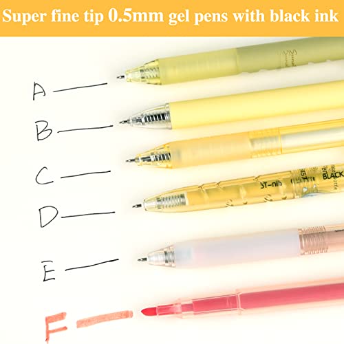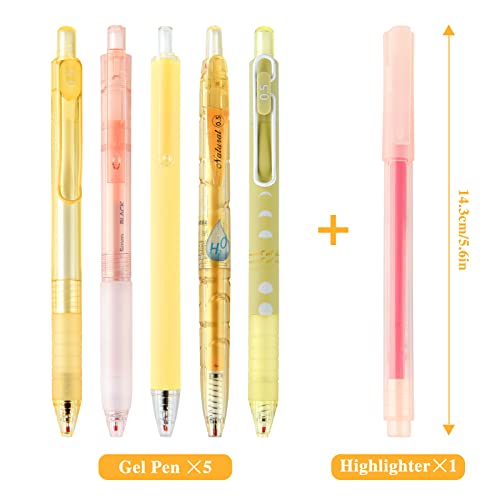 ASTARON 6 Pcs Pastel Gel Pen Set Yellow Ballpoint Pens Fine Point 0.5mm, Black Ink Pens with 1 Highlighter Cute Note Taking Pens Retractable Ballpoint Gel Pen for School Office Writing