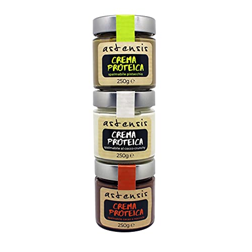 ASTENSIS Tris Proteico - Crema Proteica Spalmabile Pistacchio, Nocciola e Cocco Crunchy - Artigianali 250 Grammi - Proteine - Senza Zucchero, Senza Olio di Palma - Tris Proteico
