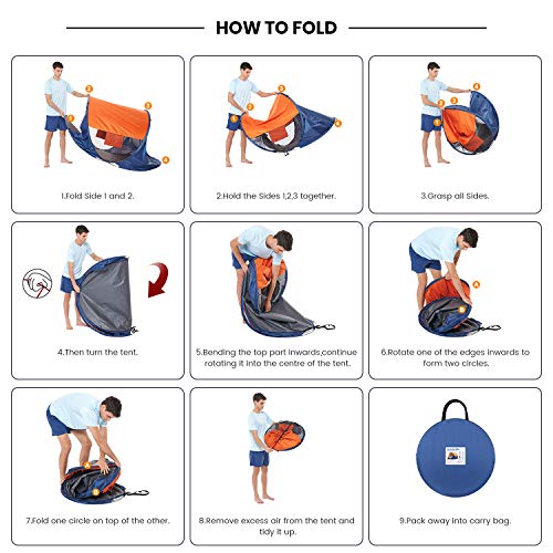 Asteri POP UP Tenda da spiaggia 2 persone Anti-UV 50+ Ripari Solari Automatico istantaneo per Interni Esterni Spiaggia Picnic Blu/Arancione
