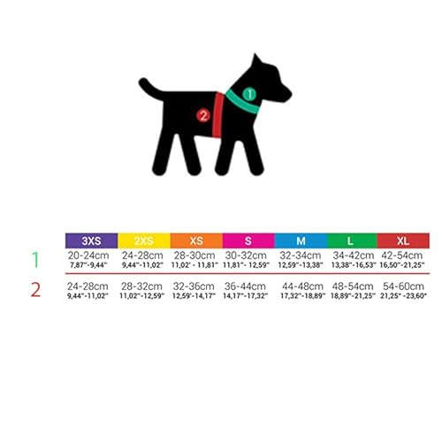 Dimensioni: misura il diametro del torace del cane: 3XS (24-28cm), 2XS (28-32cm), XS (32-36cm), S (36-44cm), M (44-48cm), L (48-54cm), XL (54-60cm).
