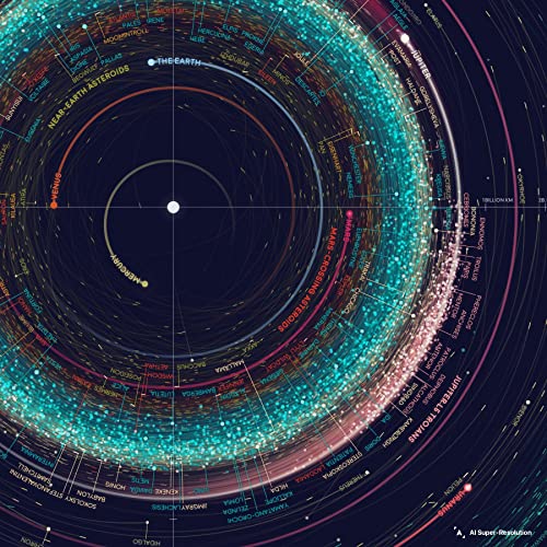OPERA D'ARTE UNICA: Questa mappa mostra le orbite di oltre 18000 asteroidi del sistema solare. Sono inclusi tutti quelli di cui si conosce il diametro superiore a 10 km - circa 10000 asteroidi - oltre a 8000 oggetti randomizzati di dimensioni sconosciute. Ogni asteroide è mostrato nella sua posizione alla vigilia del Capodanno 1999, colorato in base al tipo di asteroide. Creato dalla information designer e redattrice del New York Times Eleanor Lutz.