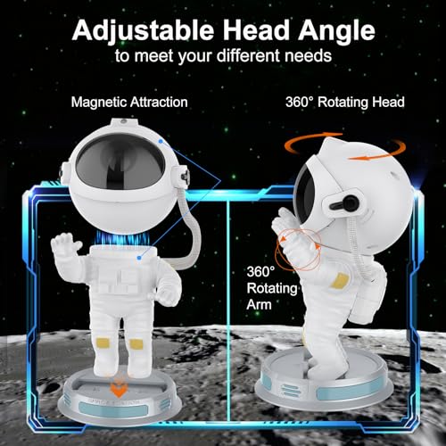 Design innovativo: La testa e la mano dell'astronauta possono essere ruotate di 360° grazie all'attrazione magnetica, consentendo di proiettare la nebulosa ovunque senza limitazioni. Il design dell'astronauta è originale e unico, che riprende il tema del cielo stellato e della galassia e vi porta a esplorare il vasto cielo stellato. Questo non è solo un proiettore di stelle, ma anche un ornamento di decorazione d'arte.