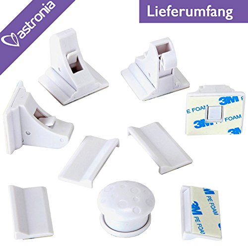 Astronia - Chiusura di sicurezza magnetica per cassetti ideale per i bebè, montaggio senza viti, non danneggia i mobili, pasta fissarla ai cassetti e agli armadietti, 4 chiusure + 1 chiave