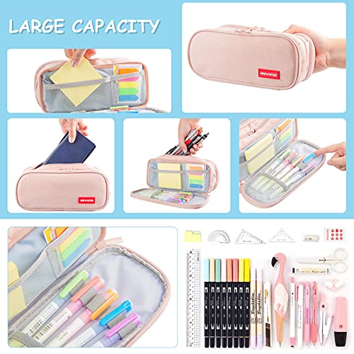 【Design Unico】 Questa custodia per matita ha una tasca ampia e due tasche con cerniera. Lo scomparto principale con cerniera può facilmente ospitare penne e una calcolatrice grafica, e le 2 tasche interne possono contenere gomme, il lato dello scomparto con cerniera che ha 5 fessure può essere riparato comunemente usato penne. Con due tasche per carte, due tasche a rete possono contenere nastro adesivo, gomma, forbici, ecc
