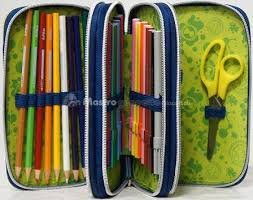 Astuccio scuola completo con 43 pezzi tutti di marca Fila e più precisamente 18 matite colorate, 18 pennarelli punta fine, 1 matita grafite, 2 penne a sfera, 1 temperino, 1 paio di forbici, 1 righello, 1 gomma, 1 evidenziatore. L'astuccio è predisposto per rimanere aperto in verticale.