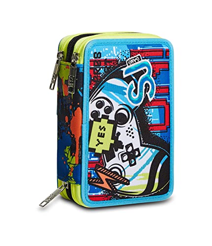 Astuccio Scuola SJ 3 Scomparti - Gamingled Boy Bambino - Completo di Matite, Pennarelli - Blu