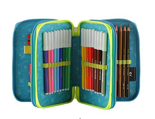 ALTRE CARATTERISTICHE:Triplo scomparto. CONTENUTO: 1 penna a sfera cancellabile, 1 penna a sfera rossa, 1 matita, 1 gomma, 1 temperino, 1 righello, 1 goniometro, 1 forbice, 1 penna a sfera, 1 colla, 18 pastelli, 18 pennarelli.