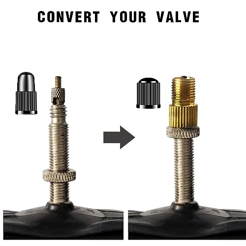 Adattatori Easy Valve Core: Converti senza sforzo le valvole della tua bici o del tuo scooter elettrico da Presta a Schrader. Usa diverse pompe per gonfiare le gomme. L'ottone massiccio di alta qualità garantisce durata, filettatura precisa per un collegamento senza problemi alla pompa dell'aria.