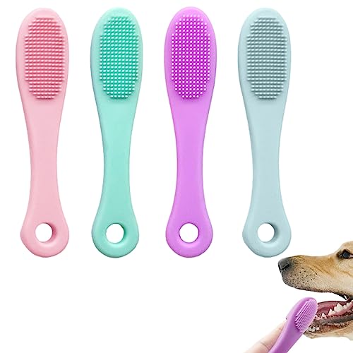 Reduziert Zahnbelag und Zahnsteinbildung: Unsere 4pcs Haustier-Silicon-Zahnbürsten (pink, lila, grün, blau) helfen Hunden dabei, Zahnbelag und Zahnstein zu reduzieren, um Zahnfleischerkrankungen vorzubeugen und einen frischen Atem zu gewährleisten.