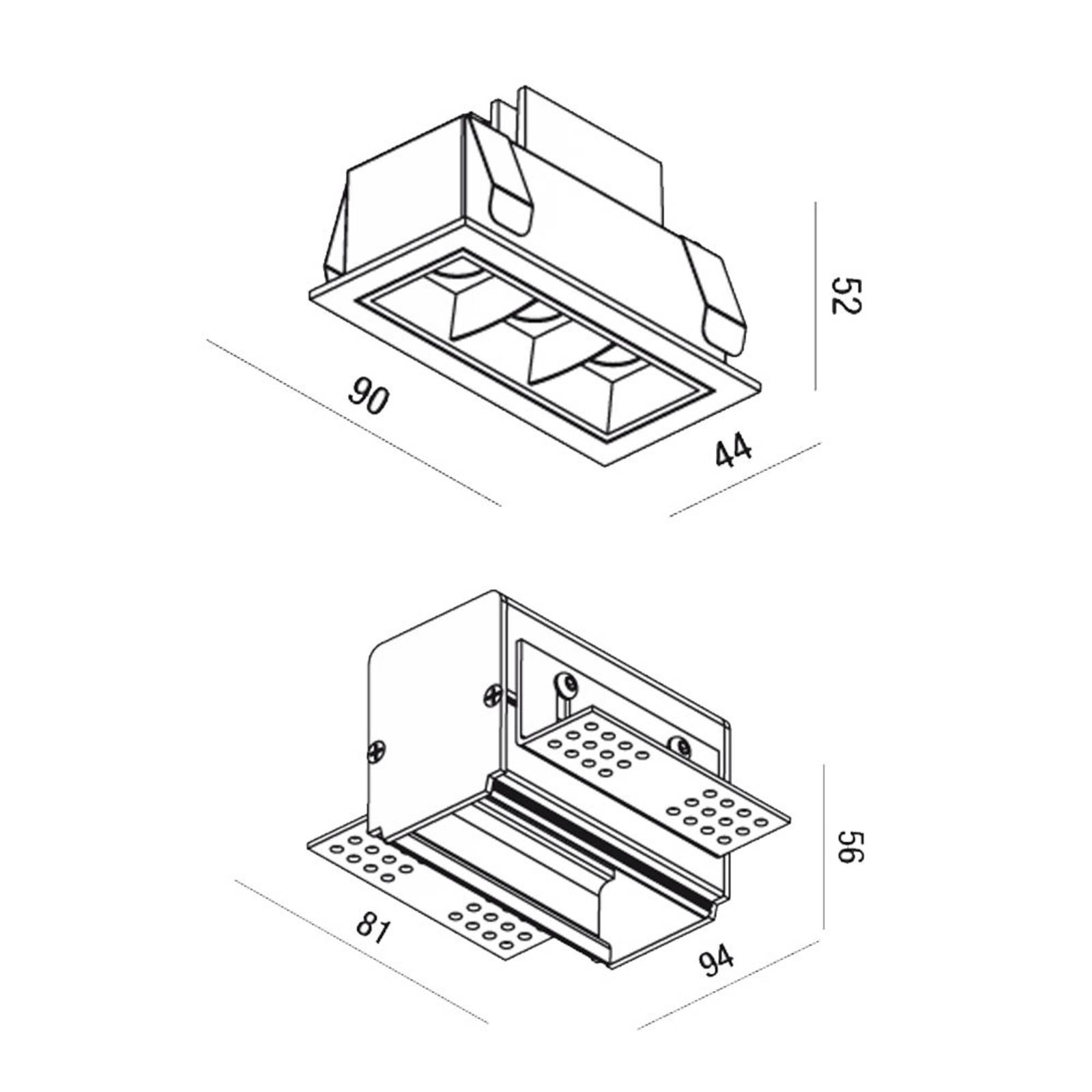 Apparecchio da incasso LED Sound 3 con cornice L'apparecchio da incasso rettangolare a tre lampade Sound 3 LED è realizzato in alluminio fuso e termoplastica ed è adatto sia a soggiorni che a negozi. Dotato di LED bianchi caldi con un alto indice di resa cromatica di Ra