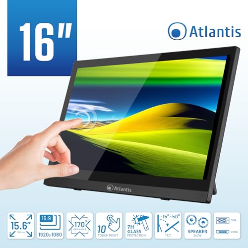 ATLANTIS A05-T16A-VHM Monitor Touch 16 pollici, schermo 16", Touchscreen 10 tocchi, Full HD 1920x1080, HDMI VGA, inclinabile 15°-50°, Vetro Protettivo 7H, Contrasto 800:1, Angolo 170/170,Vesa 75
