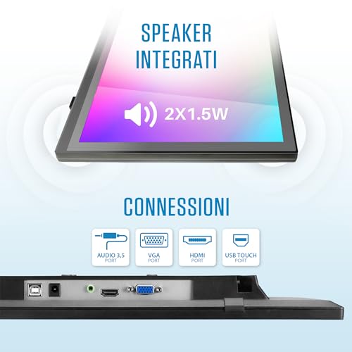 [5] - Ingressi e Uscite: Ingresso per Video ad alta risoluzione HDMI v. 1.4 con support HDCP e VGA // Porta USB Touch // Ingresso Audio Jack 3.5mm // Cavo HDMI 1.5m Incluso.
