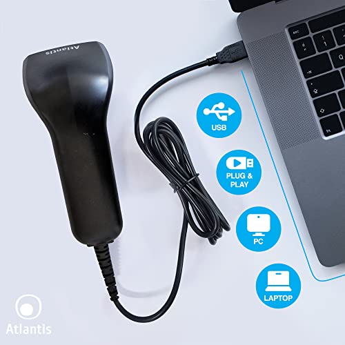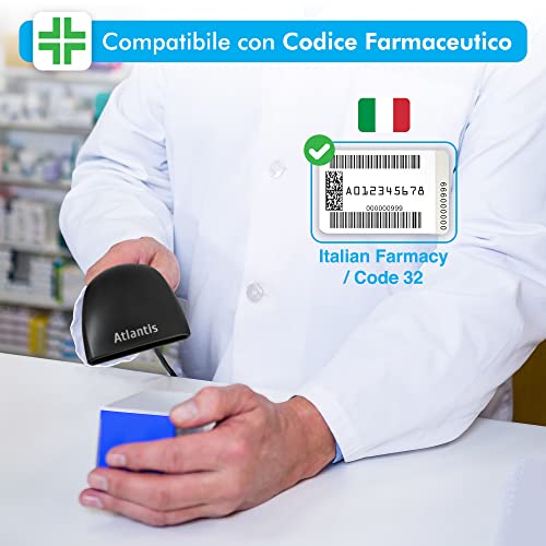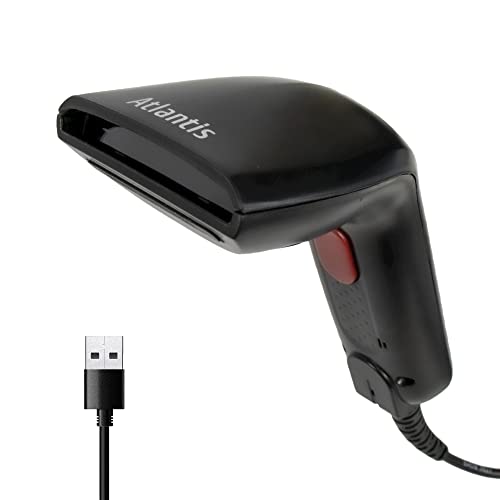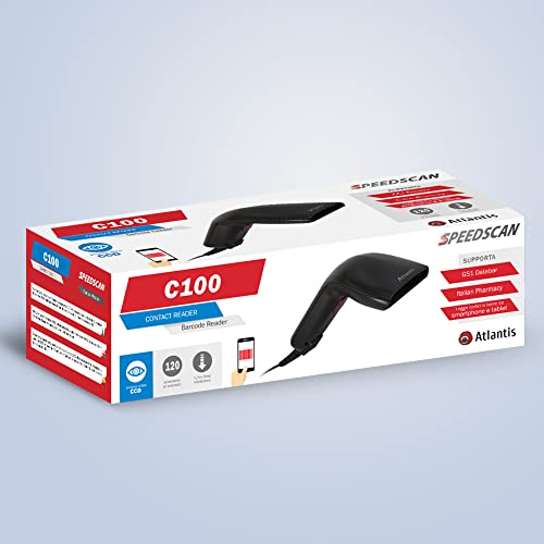 Atlantis A08-C100 Lettore Codici a Barre Barcode reader scanner 1D Ottico a contatto, 120 scansioni sec, legge da smartphone, codice farmaceutico, collegamento USB, guida rapida di installazione.