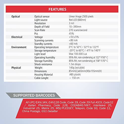 [2] - Capacità di lettura di codici a barre sino a 39 cm di distanza (in funzione della dimensione del codice a barre) // Velocità di scansione fino a 270 scansioni/secondo // Possibilità di leggere i codici a barre da Smartphone, Tablet e Schermo PC // Possibilità di impostare la lettura continua.